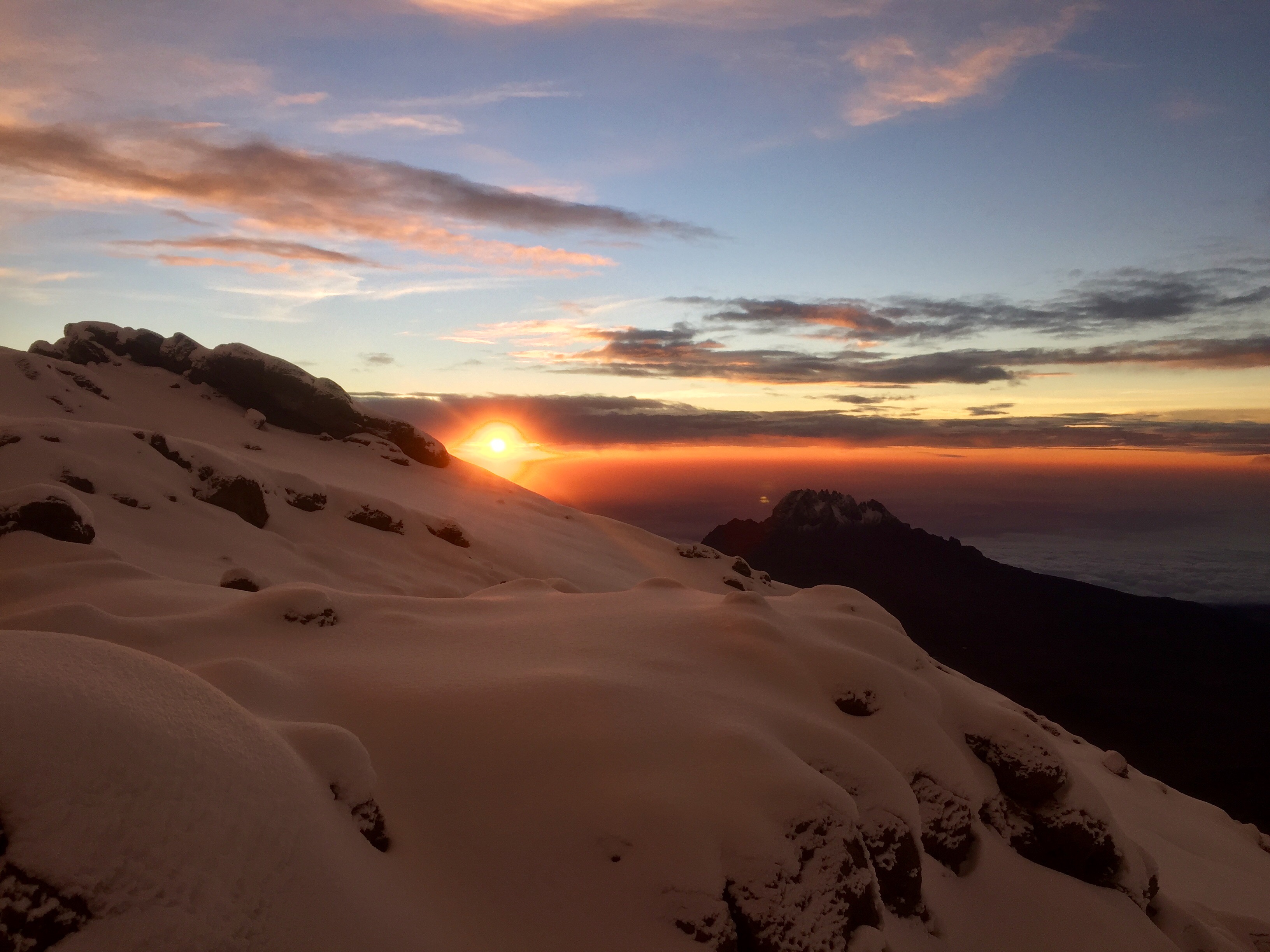 Commencing a long hard hike at midnight seems ridiculous, and it pretty much is. I asked the guides about the rationale for such a strategy. After all, we had spent days acclimating to the altitude, it seemed unwise to disrupt diurnal patterns just at the moment we were readying for the big push. They offered three explanations, each with some merit, but not entirely convincing. The hike up from Kibo huts to Uhuru peak is less than six km with a little more than 1000m altitude gain. The summit is 5895m which, for you non-metric folks is 19,341 ft. For comparison, Everest is 29,029′. The highest peak in North America is Denali (McKinley) coming in at 20,310′ and there is only one other North American peak is higher than Kilimanjaro. So the first answer had some merit– seeing the sunrise from the crater rim is an incredible experience (spoiler alert: it is). This is similar to many hiking strategies. People walk up Poon Hill in Nepal starting at 4:00 am to see the sun rise over the Annapurna massif and Daulighiri, but that is a well-marked and fairly short track. Another reason: as this is the wet season and the rains tend to start mid-morning, they like to get up and off the mountain early (missing a whole night’s sleep vs. getting wet, I dunno). And the last, which seemed both patronizing and nonsensical, was actually best. Hikers cannot see what they are climbing in the dark. It might only be six kilometers and only 1000 meters elevation gain, but it is straight up the highest mountain in Africa. I had gone out to piss around 10:00 pm, and the weather had cleared after a torrential downpour. The skies were filled with stars for the first time in several days, though the only constellation I could recognize was Orion (as usual). At 11:00, we got up, had coffee and biscuits (cookies), and by the stroke of midnight we were walking out of camp, each wearing a headlamp directed at our feet, except Anna who carried a torch (flashlight) and consequently had a pretty cold hand most of the walk. We walked out over lava cinders for a short while, but soon it started to snow, the dusting accumulating in the shadow of the stones. We soon discovered that yesterday’s rain had made snow up high, and within the hour we were in ankle-deep powder. People wealthy enough to ski celebrate that stuff, but climbing a mountain in it is profoundly difficult. Off we set, Abu picking out the path and each of us following single file, seeing only the terrain illuminated by our headlamps and concentrating on the footprints directly in front of us. This would go on for six hours–SIX HOURS. Initially, I treated it the way I do all long treks. Walking is an opportunity to think. Indeed, for me, it is the best chance for thinking. I’ve been re-reading Whitehead’s Process and Reality, so it was a good time to consider “actual occasions” and “prehensions.” But we were soon gaining altitude, and the path became more faint and steep. My next “pointless essay” will be about Air (I already have fire–Vital Heat–and Water, so I am well on the way to covering the original four elements, will just then need Earth). Walking at high altitude is a curious and subtle experience. I found doing the Kili shuffle–placing one foot directly in front of the other, heel to toe with no space between (very much the Pink Floyd The Wall walk)–I could mentally explore the intricacies of Whitehead’s philosophy of organism, but soon the lack of oxygen took effect, and I could only see the feet stepping in front of me, step after step, hour after hour. I tried to focus but found I was only able to direct my thoughts toward very intense moments from my past. They had life and vibrancy, but soon faded in the monochromatic landscape I crossed. Walking in snow is physically taxing, so as the air thinned, each simple misstep or slip interrupted carefully patterned breathing, which in turn made me stop and pant, trying to get oxygen balance back. This kept the experience from becoming like meditation, which is the closest activity I can imagine to a pitch-black, many hours, strenuous trek. Like meditation, I concentrated on my breath, but that was not to find release. Instead my body demanded it. Imagine turning to spit and that takes you out of a breathing rhythm and causes distress. The other factor was the cold. Here is where hiking at night was good, as there was little wind. Still, it was well below freezing and my hands would often ice up. I had borrowed one of those down jackets like those people wear on Everest, and found if I pulled up the down-filled hood, my body temperature would go up and my hands would warm. But of course if you get too hot and start to sweat, chills can occur and soon you are heading off the mountain on a stretcher. Thoreau was right, Vital Heat is vital. The snow slowed our pace — it locked it down– so we arrived at Gilman’s point on the crater rim much later than expected. Kilimanjaro is a dormant volcano– a singular peak rising out of the Rift Valley that characterizes the geology of East Africa. We rested briefly, and for the first time could see beyond the halos of our headlamps. The sun washed across the landscape, making shadows of unbelievable intensity and finally breaking the monochrome of our night walk. The break was short because the risk of chill is higher than the need to rest. By now I was really feeling the altitude. Last month I had crossed Thorung La in Nepal (5400+m) with little distress, but given the exertion of climbing in snow, I was gasping for oxygen and feeling many of the symptoms of altitude sickness. Abu explained later that our trek, in the deep new snow, was exceptionally strenuous so he was not surprised that I was feeling it. I was uncomfortable but felt capable to continue the last bit of the climb around the crater rim to Uhuru point. Of course it was much longer than any of us hoped but soon we gathered around the sign which signaled the end
